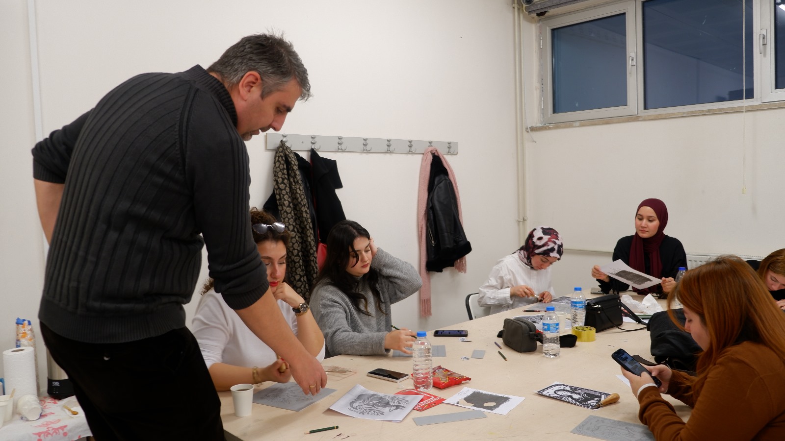 Etkinlik kapsamında, Sanat, Tasarım ve Mimarlık Fakültesi Arş. Gör. Dr. Ali Gümülcine’nin linol baskı tekniğiyle hazırladığı çalışmalar uygulamalı olarak incelendi.