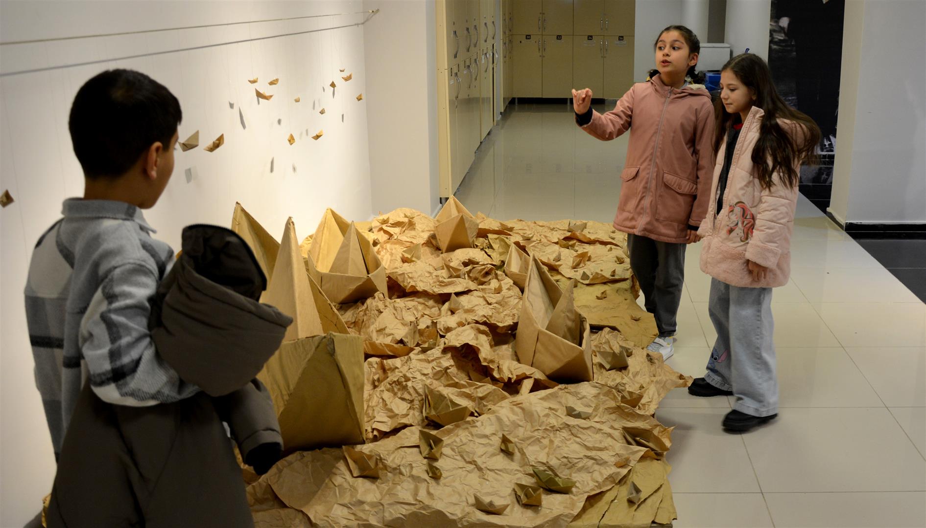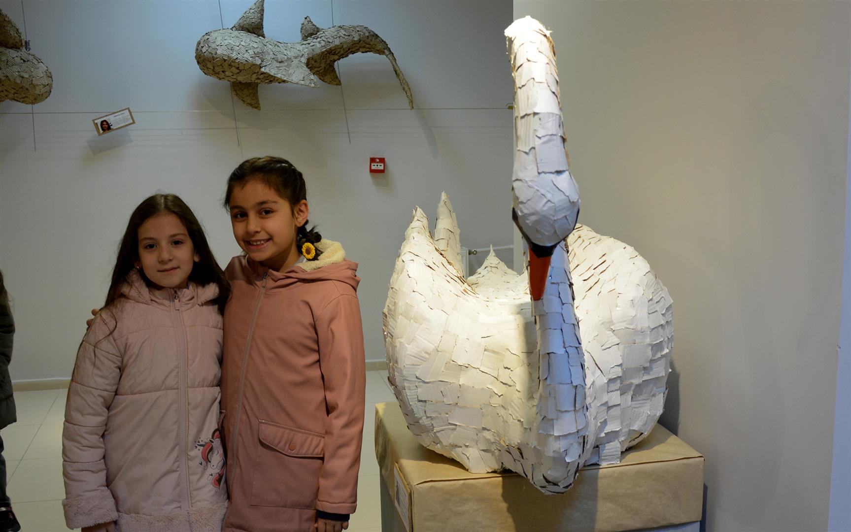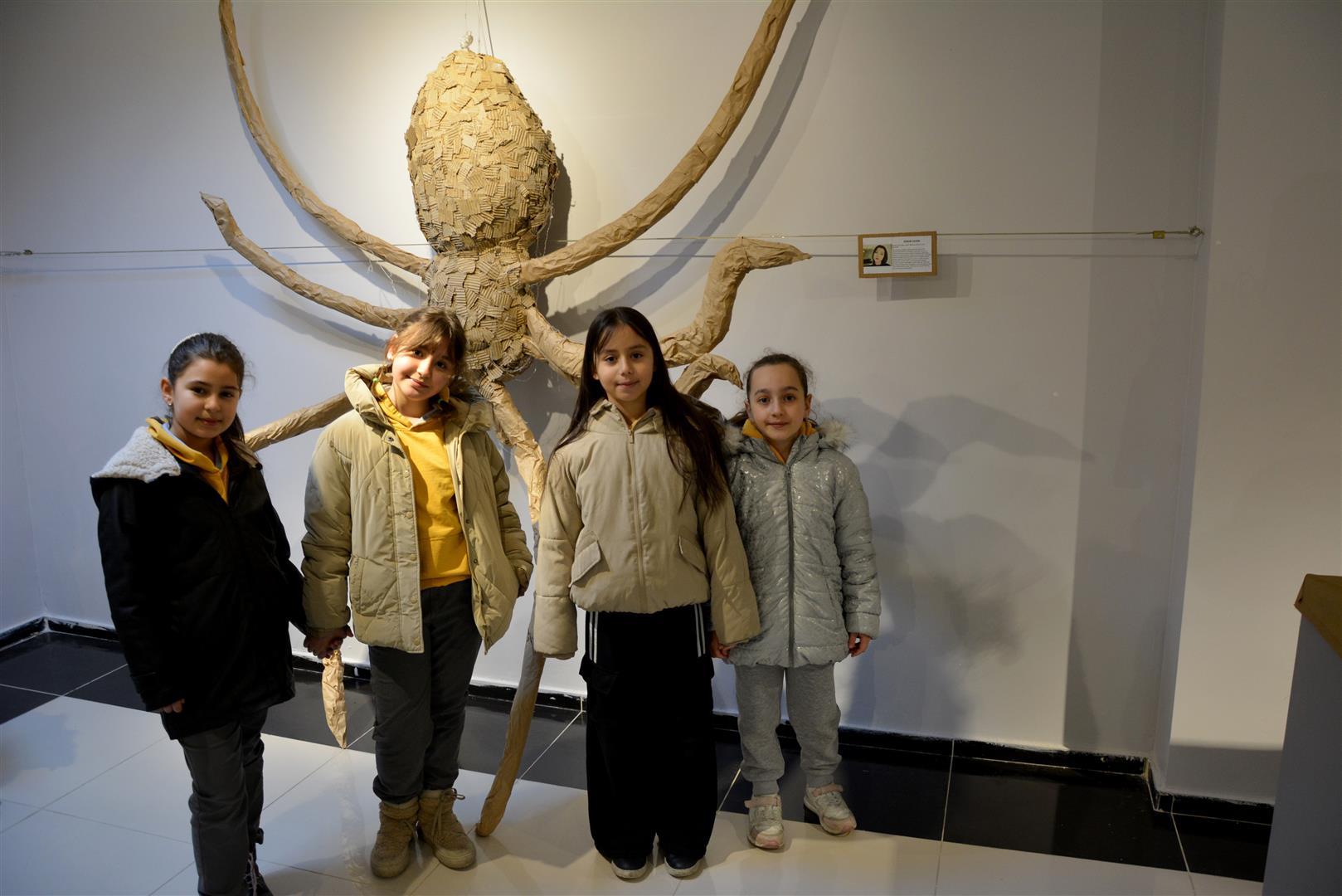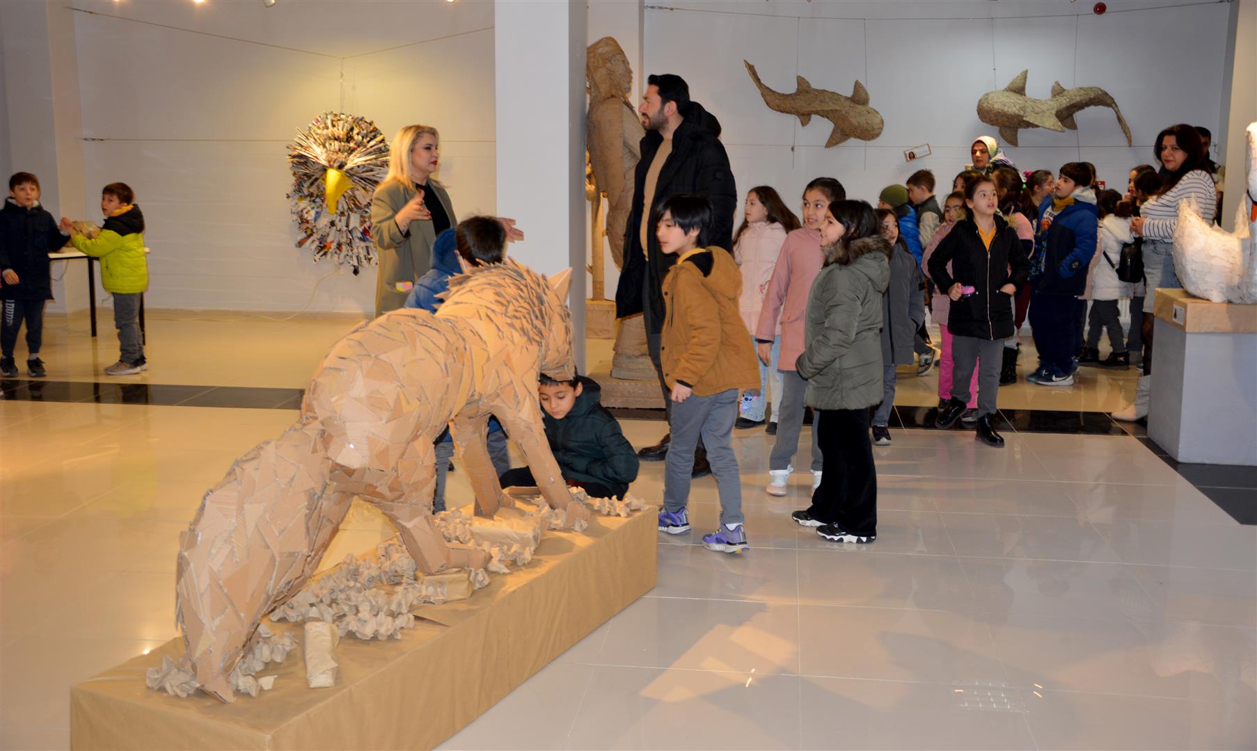 Sergide yer alan eserleri büyük bir ilgiyle gezen minik öğrenciler, geri dönüşüm ve çevre bilinci temasıyla hazırlanan heykeller hakkında merak ettikleri soruları yöneltti.